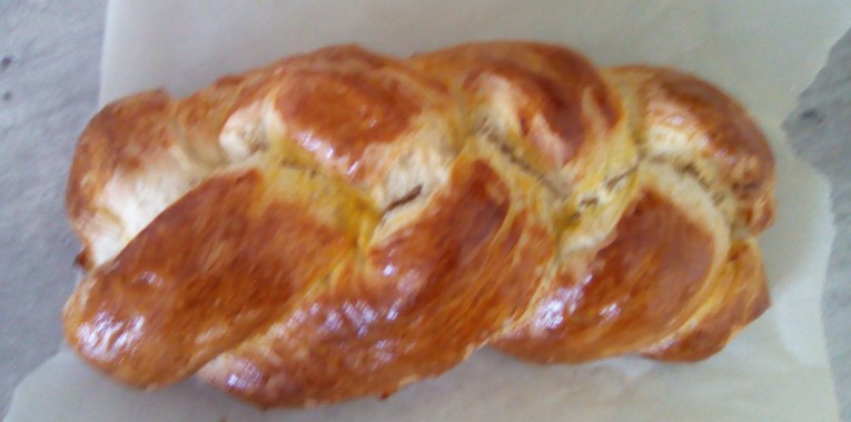 Dorer la tresse à l’œuf battu, et faire cuire 30-40mn sur du papier sulfurisé.