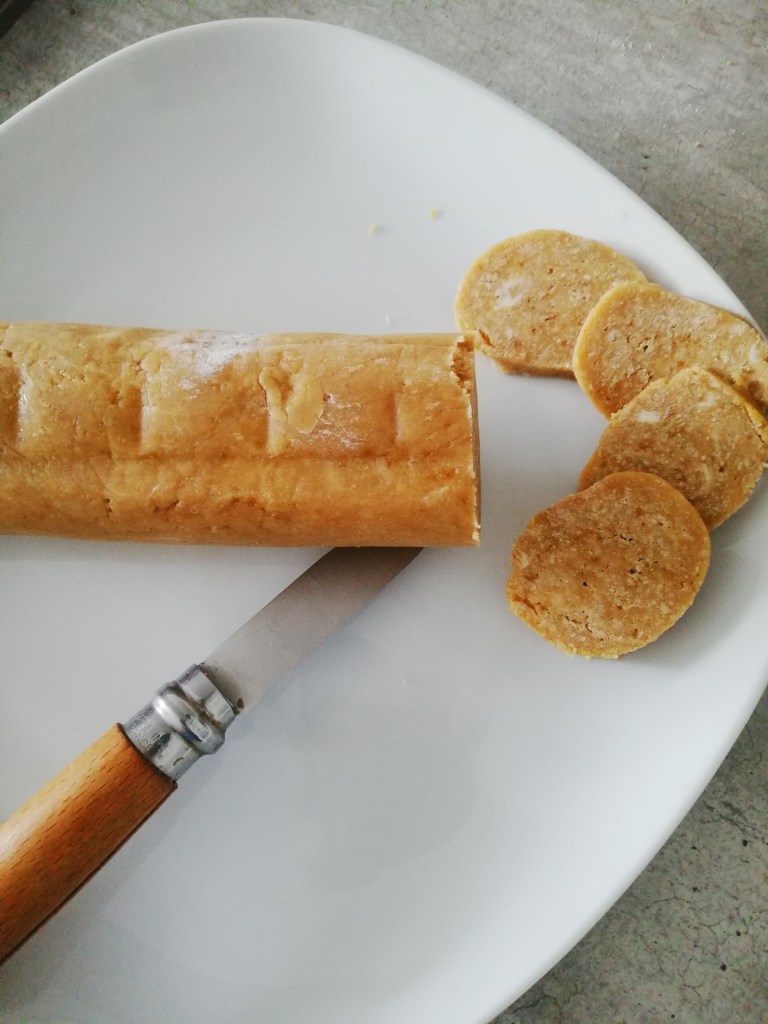 Pétrir à la main jusqu’à obtenir une pâte homogène. Former une boule, et la rouler de manière à obtenir un boudin de pâte bien compact (le diamètre sera celui de vos futurs biscuits). L’envelopper de film alimentaire bien serré. Le placer 1h (voire plus) au congélateur.