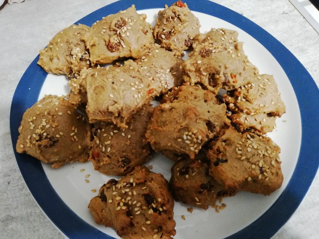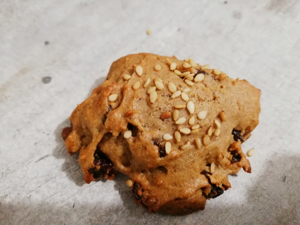 Déposer de petits tas de pâte sur la plaque du four. Ils n’auront pas forcément une jolie forme, mais ce n’est pas grave. Les espacer un peu car ils vont gonfler. Parsemer de graines de sésame.