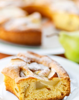 Verser la moitié de la pâte dans un moule. Recouvrir avec les morceaux de poires, et y verser l’autre moitié de la préparation.